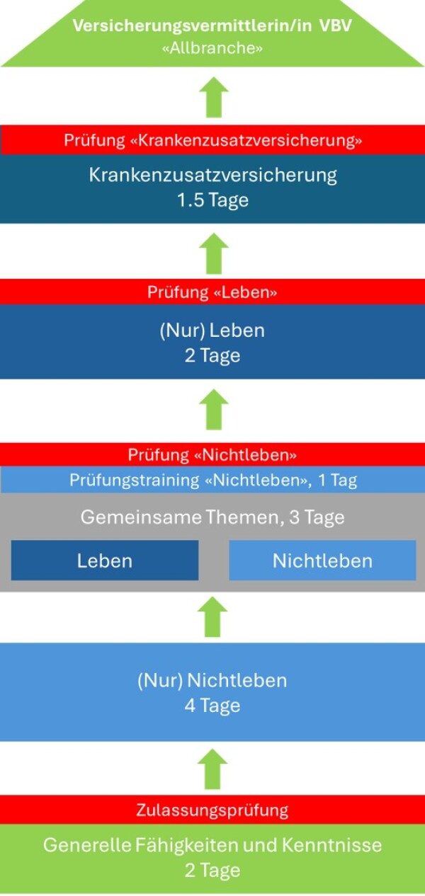 • Mit dem Bestehen erhalten Sie Zugang zu den Prüfungsteilen «Nichtleben», «Leben» und «Krankenzusatzversicherung». Der Vorbereitungskurs dauert 11.5 Tage, gefolgt von den entsprechenden VAG-Zulassungsprüfungen (2x schriftlich & 1x mündlich, 30 Min).