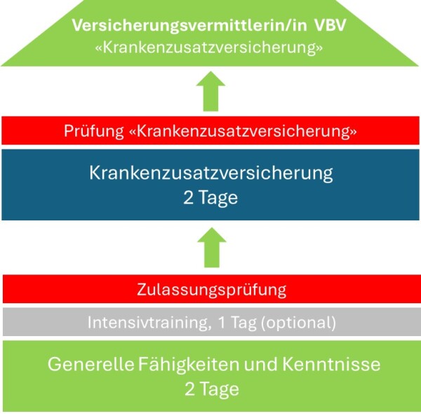 • Mit dem Bestehen erhalten Sie Zugang zum Prüfungsteil «Krankenzusatzversicherung». Der Vorbereitungskurs dauert 3 Tage, gefolgt von der VAG-Zulassungsprüfung (schriftlich, online, 30 Minuten).