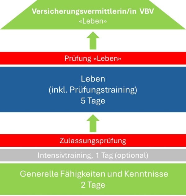 • Mit dem Bestehen erhalten Sie Zugang zum Prüfungsteil «Leben». Der Vorbereitungskurs dauert 5 Tage, gefolgt von der VAG-Zulassungsprüfung (mündlich, 30 Minuten).