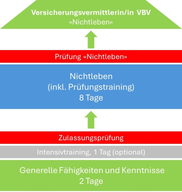 • Mit dem Bestehen erhalten Sie Zugang zum Prüfungsteil «Nichtleben». Der Vorbereitungskurs dauert 8 Tage, gefolgt von der VAG-Zulassungsprüfung (schriftlich, online, 60 Minuten).